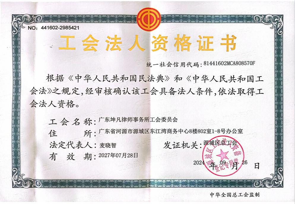 一、基本情况:广东坤凡律师事务所经广东省司法厅批准设立的,是广东省政府法律服务采购库入库单位,为社会各界提供综合性法律服务的律师事务所,位于广东省河源市源城区永康大道东江湾商务中心八楼,地理位置优越、交通便利,车位充足,律所拥有一流的办公设备、全江景的办公区。2025年4月成立了中共广东坤凡律师事务所支部委员会,坚持党建引领,坚守党建促所建,不断加强党组织建设,始终坚守法律人的职业操守,做好法律的践行者、守护者。2024年7月成立了广东坤凡律师事务所工会委员会,是河源市第一家设立工会组织的律师事务所。团队成员主要由原广东天穗(河源)律师事务所精英骨干组成,团队于2023年获司法部颁发的“全国法律援助先进集体”荣誉称号(国字号荣誉)。律所建立了完善的行政管理制度,全面运用Alpha法律智能软件全功能操作系统(简称:Alpha系统),结合科学的公司化管理模式,利用丰富的法律实务经验,争做河源市优秀律师团队的先锋者。广东坤凡律师事务所分设多个专业部门,设立了重大案件研究中心、金融保险法律专业委员会、劳动和社会保障法专业委员会、建设工程专业委员会、投标委员会、政府法律顾问委员会等,在秉承专业化法律服务理念的同时,不断开拓新的法律服务范围,在深厚法学理论基础和丰富法律实践的基础上,向规范化、专业化、品牌化持续发展。