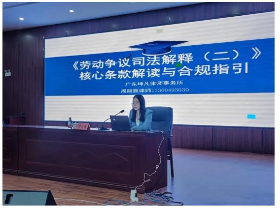11月7日上午,源城区2025年新兴领域党务工作者培训班邀请广东坤凡律师事务所合伙人、党员律师周丽雅作企业劳动用工合规管理与法律风险防范专题授课,周丽雅律师为源城区100多名新兴领域党务工作者开展了一场主题为《<劳动争议司法解释(二)>核心条款解读与合规指引》的专题讲座。