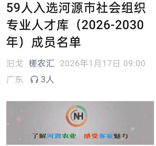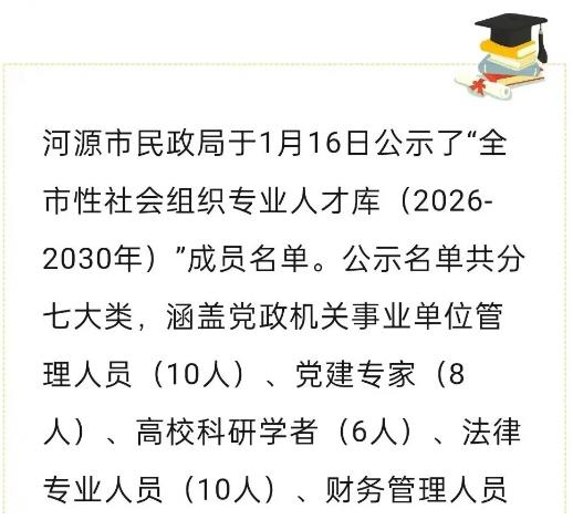 河源市民政局于1月16日公示了“全市性社会组织专业人才库(2026-2030年)”成员名单,本次人才库共纳入59名专业人才,分为党政机关事业单位管理人员、党建专家、法律专业人员等七大类别。田书锐律师凭借深厚的法律专业功底和丰富的实务经验,在法律专业人员类别中成功入选。