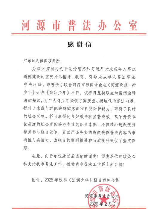 近日,广东坤凡律师事务所收到河源市普法办公室发来的感谢信,信中对我所积极参与青少年普法工作、助力《法润少年》栏目顺利推进所作出的突出贡献,致以最诚挚的谢意,这份认可既是荣誉,更是责任。