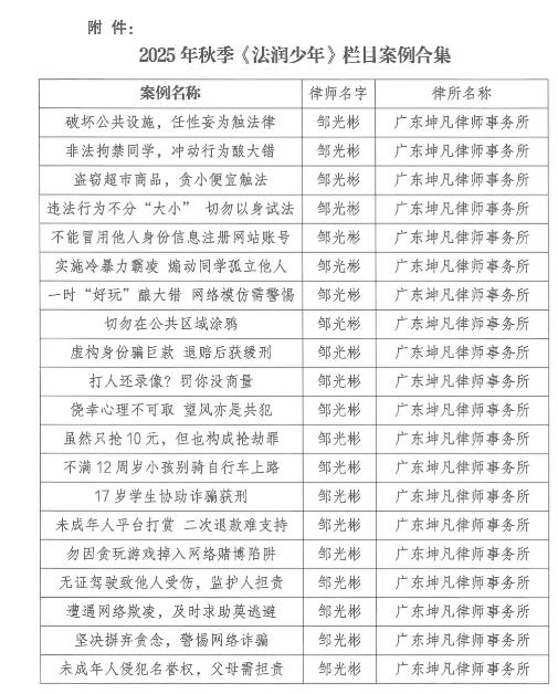 其中,我所合伙人邹光彬律师全程积极投身栏目建设,先后撰写20篇青少年普法案例,涵盖破坏公共设施、网络欺凌、校园霸凌、网络诈骗、未成年人驾驶等多个与青少年日常生活密切相关的领域,用专业视角拆解法律难题,用通俗语言传递法治理念,助力青少年树立正确的法治观,学会用法律武器保护自己。