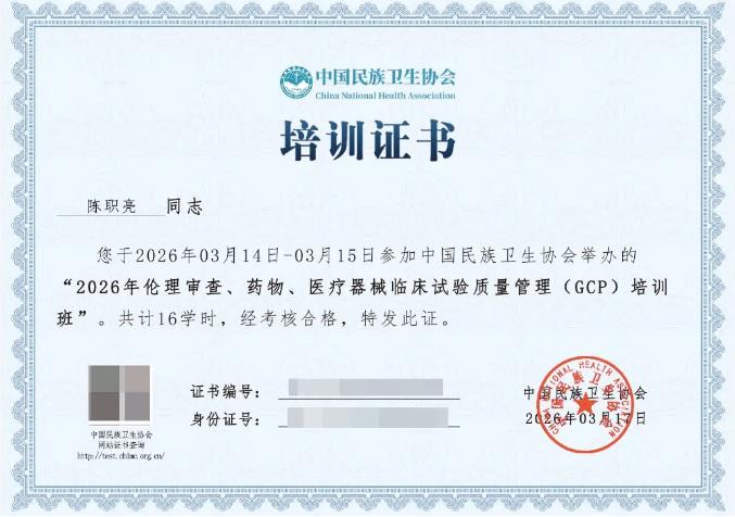 专业精进,步履不停。为进一步强化在医疗医药、生命科学领域法律服务的专业能力,精准把握临床试验全流程合规管理要点,近日,广东坤凡律师事务所张咏僖律师、陈职亮律师参加中国民族卫生协会主办的 “伦理审查、药物、医疗器械临床试验质量管理(GCP)专项培训”,经考核,顺利取得培训合格证书。